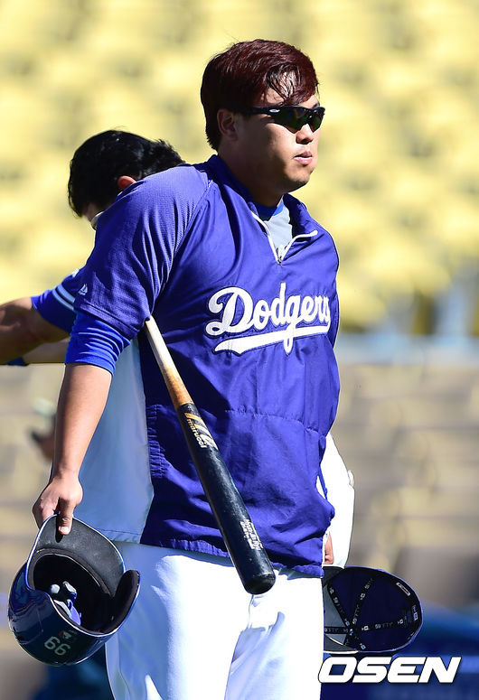 2일(한국시간) 미국 캘리포니아주 로스앤젤레스 다저스타디움에서 열리는 '2014 메이저리그' LA 다저스와 클리블랜드 인디언스와의 경기에 앞서 다저스 류현진이 타격훈련을 마친 뒤 더그아웃으로 들어가고 있다.