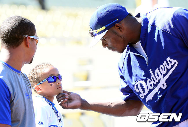 2일(한국시간) 미국 캘리포니아주 로스앤젤레스 다저스타디움에서 열리는 '2014 메이저리그' LA 다저스와 클리블랜드 인디언스와의 경기에 앞서 다저스 푸이그가 맷 켐프의 조카와 이야기를 나누고 있다.