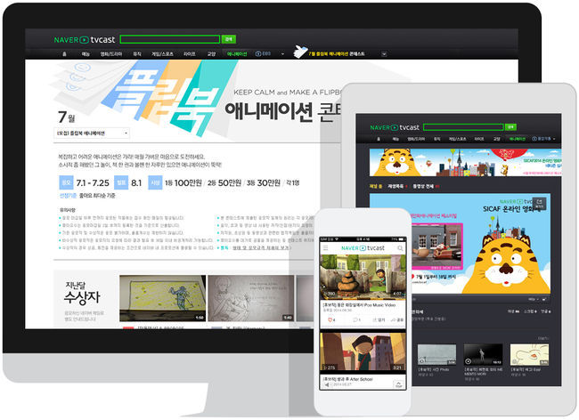 우선 다양한 사용자가 애니메이션을 직접 만들고 즐길 수 있도록 플립북 애니메이션 공모전(tvcast.naver.com/flipbook201407)을 7월부터 매달 진행한다. ‘플립북’이란 여러 장으로 이어지는 그림을 한 권의 책으로 만들어 책장을 빠르게 넘기면 마치 그림이 움직이는 것처럼 보이도록 하는 애니메이션 기법으로 책과 펜만 있으면 누구나 쉽게 만들 수 있다. 응모기간은 매달 1일부터 25일까지며 소재는 자유다. 매달 ‘좋아요’를 많이 받은 순서대로 3등까지 선발해 상금을 수여한다.