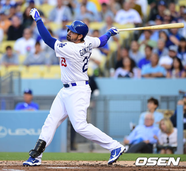 1회말 1사 2루 다저스 곤잘레스가 투런 홈런을 때리고 있다.