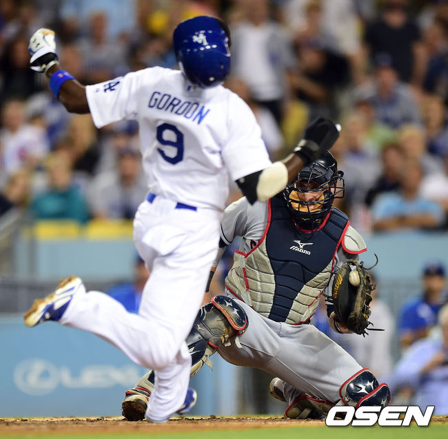 4회말 무사 1,3루 다저스 디 고든이 곤잘레스의 안타때 홈으로 쇄도하다 아웃당하고 있다.
