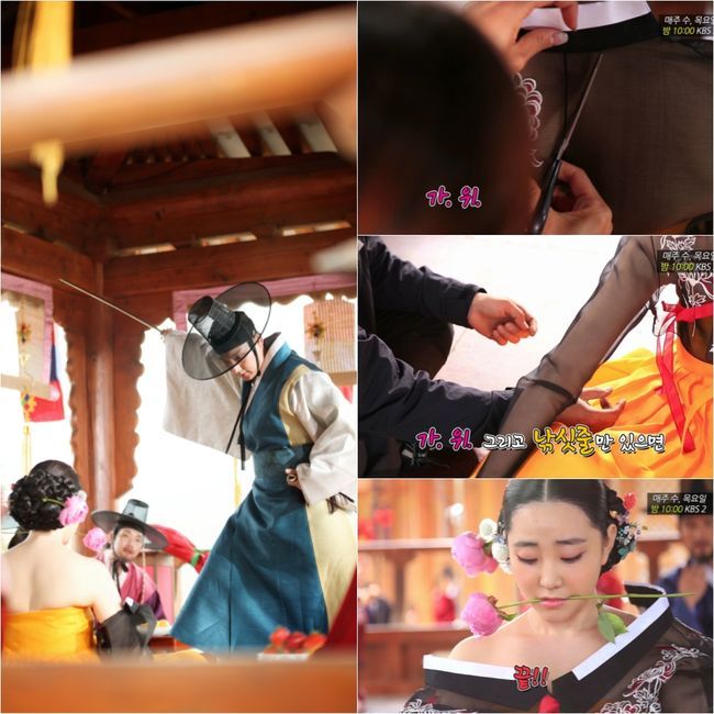 영상에는 첫 등장부터 신들린 검술을 선보인 박윤강 역 이준기의 ‘비밀’이 담겼다. ‘조선 총잡이’ 첫 회에서 윤강은 검으로 꽃기생의 저고리를 싹둑 베어냈는데, 이 영상에 따르면 이준기의 화려한 검술 뒤에는 바로 가위와 낚시줄이 있었다. 미리 살짝 잘라놓은 저고리에 줄을 연결해놓았고, 이준기의 검 액션과 합을 맞춰 스태프들이 줄을 당겨 저고리를 벗겨낸 것.
