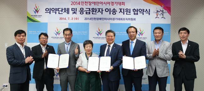 2014인천장애인아시아경기대회 조직위원회(위원장 김성일, 이하 조직위)는 2일 미추홀타워 19층 영상상황실에서 인천약사회와 인천한의사회 등 의약단체 두 곳과 인천129응급환자이송단과 업무 협약을 맺었다.