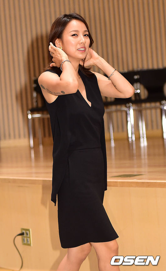 가수 이효리가 제작발표회에 참석해 인사말을 하기 위해 무대에 오르고 있다.