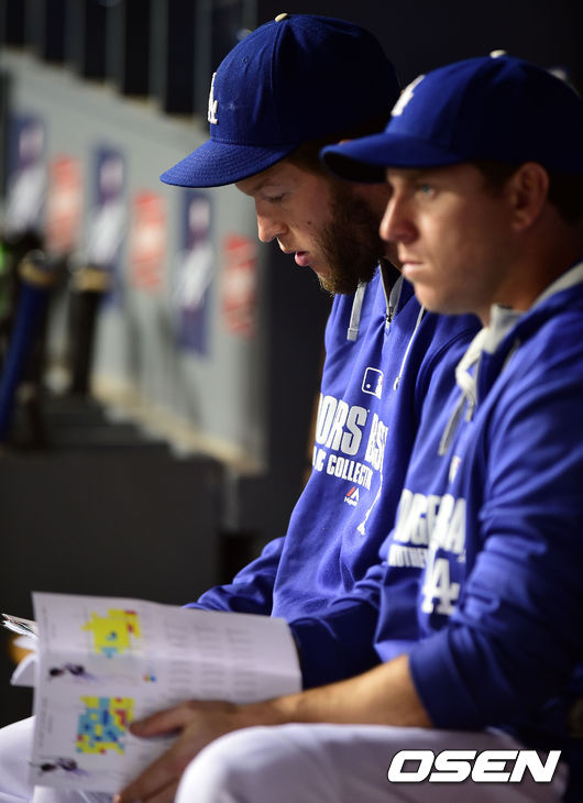 다저스 커쇼와 A.J 엘리스가 더그아웃에 앉아 볼 배합에 대해 이야기를 나누고 있다./youngrae@osen.co.kr