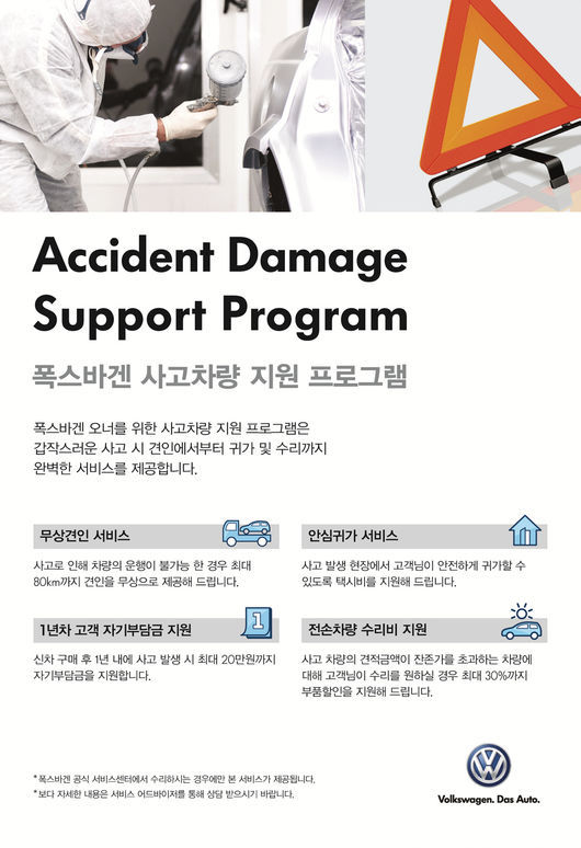 본 프로그램은 사고 현장 수습부터 사고 수리까지 체계적인 사후 관리 서비스를 지원하고자 하는 폭스바겐의 고객 서비스 일환으로 기획됐다. 공식 서비스센터를 통해 사고 수리를 진행하는 폭스바겐 오너라면 누구든 이용할 수 있으며, 문의는 전국 공식 폭스바겐 서비스센터나 24시간 고객지원센터를 통해 가능하다.