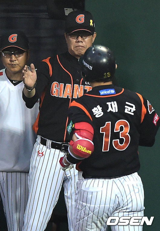 2일 오후 서울 목동구장에서 열린 '2014 한국야쿠르트 세븐 프로야구' 넥센 히어로즈와 롯데 자이언츠의 경기 2회초 1사 1루 황재균이 투런포를 치고 김시진 감독과 하이파이브를 하고 있다.