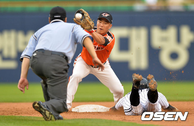 2회말 2사 1루에서 LG 손주인 타석때 1루주자 오지환이 도루에 실패하고 아쉬운 표정을 짓고 있다.