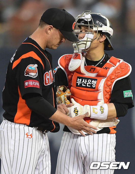 2일 오후 서울 목동구장에서 열린 '2014 한국야쿠르트 세븐 프로야구' 넥센 히어로즈와 롯데 자이언츠의 경기 2회말 2사 1,2루 박병호 타석, 용덕한과 옥스프링이 이야기를 나누고 있다.