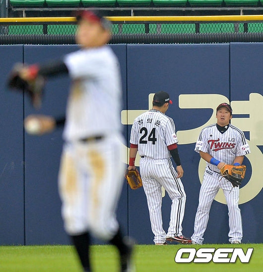 4회초 1사에서 한화 피에의 잘맞은 타구를 외야플라이로 처리한 LG 이병규가 정의윤과 이야기를 나누고 있다.