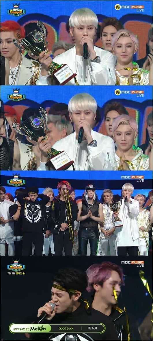 비스트는 2일 생방송으로 전파를 탄 MBC뮤직 음악프로그램 ‘쇼 챔피언’에서 1위인 챔피언송을 수상했다.