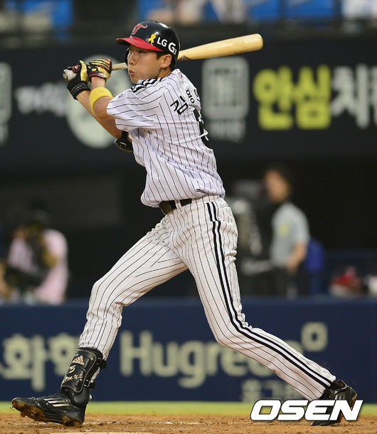 4회말 2사 주자2루 LG 김용의가 1타점 적시타를 치고 있다.