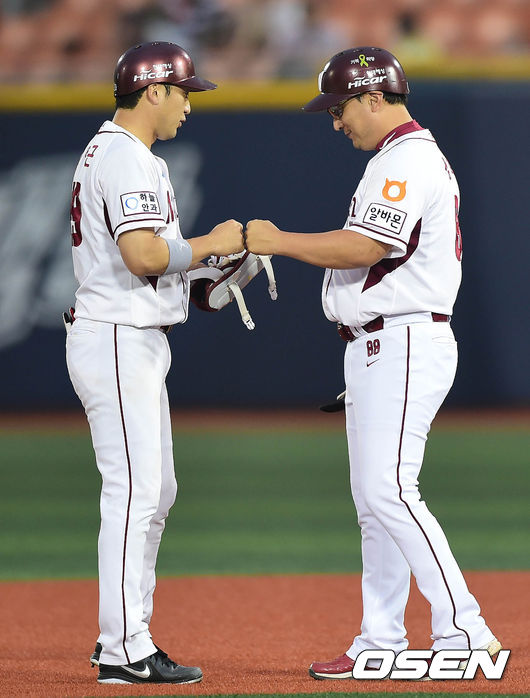 2일 오후 서울 목동구장에서 열린 '2014 한국야쿠르트 세븐 프로야구' 넥센 히어로즈와 롯데 자이언츠의 경기 4회말 2사 2루 이택근이 1타점 2루타를 치고 심재학 코치와 하이파이브를 하고 있다.