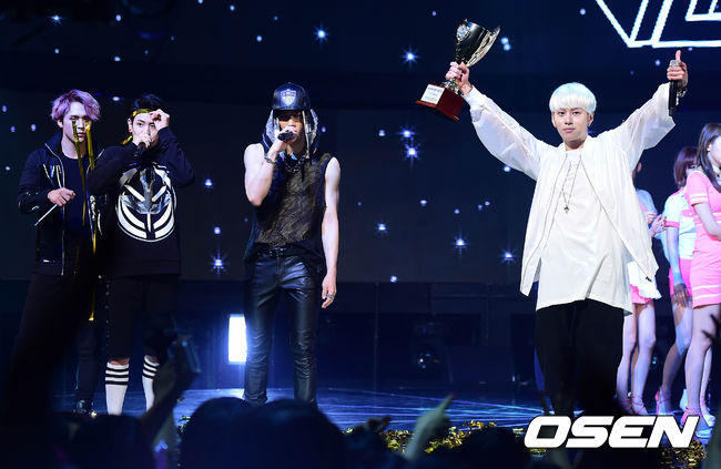 그룹 비스트가 신곡 '굿럭(Good luck)' 으로 '쇼 챔피언' 1위를 차지한 뒤 기뻐하고 있다.