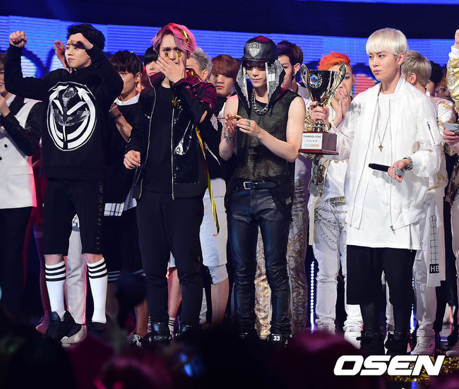 그룹 비스트가 신곡 '굿럭(Good luck)' 으로 '쇼 챔피언' 1위를 차지한 뒤 소감을 전하고 있다.