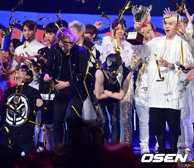 그룹 비스트가 신곡 '굿럭(Good luck)' 으로 '쇼 챔피언' 1위를 차지한 뒤 환호하고 있다.