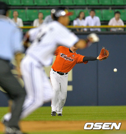 6회말 1사 2루에서 한화 최진행이 LG 정의윤의 타구를 놓치고 있다.