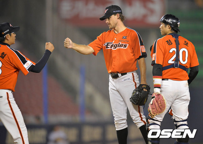 6회말 1사 2,3루에서 한화 타투스코가 마운드를 내려가며 정민철 코치와 하이파이브를 하고 있다.
