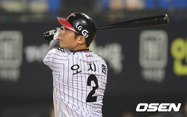 6회말 2사 만루 LG 오지환이 2타점 2루타를 치고 있다.