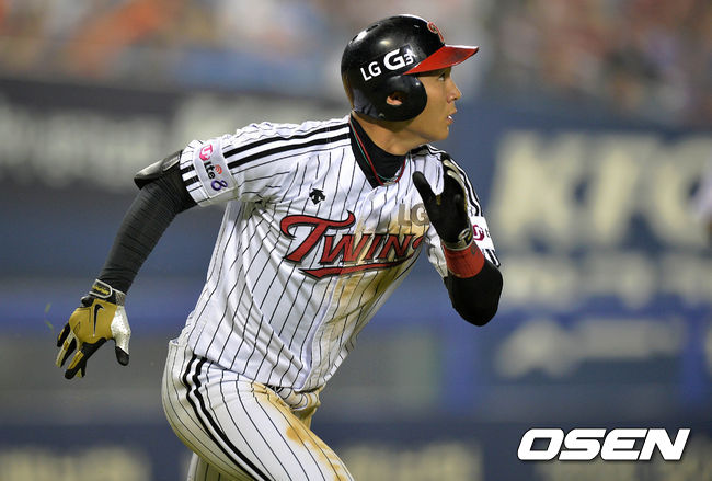6회말 2사 만루에서 LG 오지환이 2타점 적시 2루타를 날리고 그라운드를 달리고 있다.