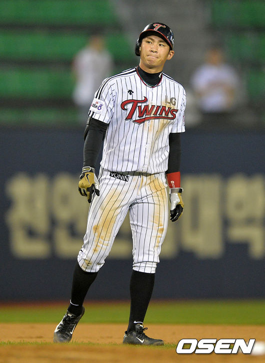6회말 2사 만루에서 LG 오지환이 2타점 적시 2루타를 날리고 타임을 외치고 있다.
