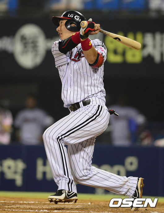 6회말 2사 주자2루 손주인이 1타점 적시타를 치고 있다.