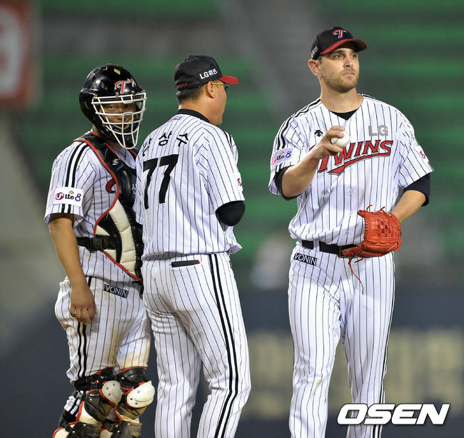 7회초 무사 1루에서 LG 리오단이 마운드를 내려가고 있다.