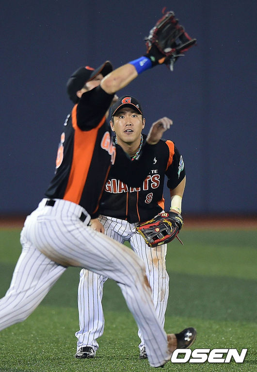 2일 오후 서울 목동구장에서 열린 '2014 한국야쿠르트 세븐 프로야구' 넥센 히어로즈와 롯데 자이언츠의 경기 6회말 선두타자 서건창의 플라이볼을 잡는 박종윤을 전준우가 바라보고 있다.