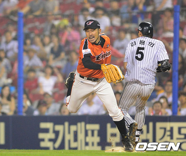 7회말 2사 주자 1루 한화 2루수 정근우의 실책으로 김용의가 1루에서 세이프 되고 있다.