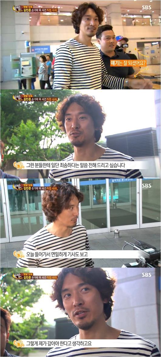 김민준은 2일 방송된 SBS 연예정보프로그램 ‘한밤의 TV연예’에서 지난 달 28일 공항에서 마주친 사진 기자들이 사진을 찍는다는 이유로 손가락 욕설을 한 것에 대해 사과의 뜻을 전했다.