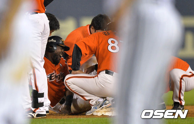 9회초 1사 1루에서 한화 송광민의 병살타때 2루로 쇄도하던 1루주자 피에가 슬라이딩 과정에서 고통스러워하고 있다./sunday@osen.co.kr