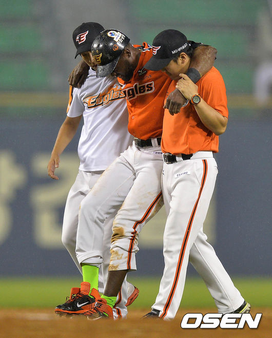 9회초 1사 1루에서 한화 송광민의 병살타때 2루로 쇄도하던 1루주자 피에가 슬라이딩 과정에서 고통스러워하며 동료들의 부축을 받아 경기장을 나가고 있다./sunday@osen.co.kr