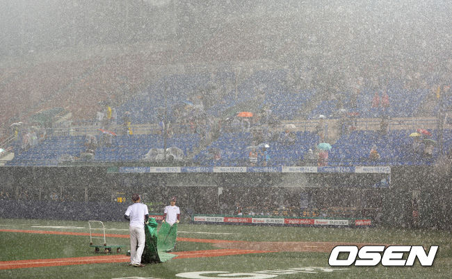 2일 오후 서울 목동구장에서 열린 '2014 한국야쿠르트 세븐 프로야구' 넥센 히어로즈와 롯데 자이언츠의 경기 8회말 우천으로 경기가 중단되고 있다.