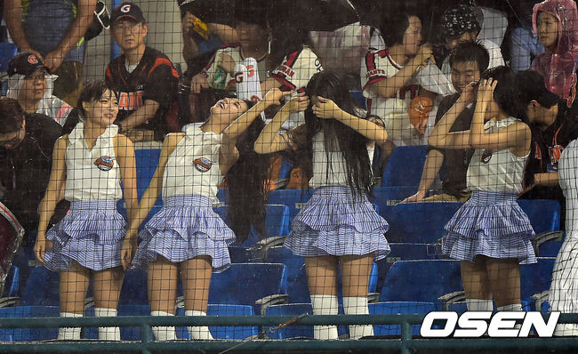 2일 오후 서울 목동구장에서 열린 '2014 한국야쿠르트 세븐 프로야구' 넥센 히어로즈와 롯데 자이언츠의 경기, 비가 내리는 가운데 치어리더들이 비 맞은 머리를 정리하고 있다.