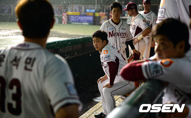 2일 오후 서울 목동구장에서 열린 '2014 한국야쿠르트 세븐 프로야구' 넥센 히어로즈와 롯데 자이언츠의 경기 우천 중단 때 이택근이 덕아웃에 앉아 있다.