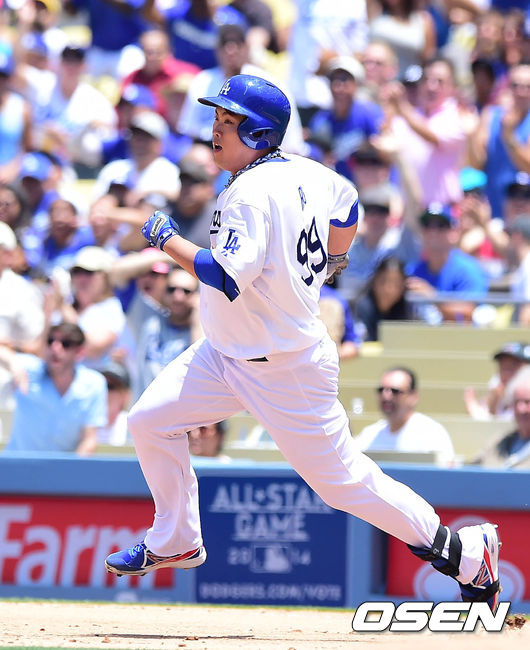3일(한국시간) 미국 캘리포니아주 로스앤젤레스 다저스타디움에서 열린 '2014 메이저리그' LA 다저스와 클리블랜드 인디언스와의 경기, 5회말 2사 1루 류현진이 1타점 2루타를 치고 베이스를 돌고 있다.