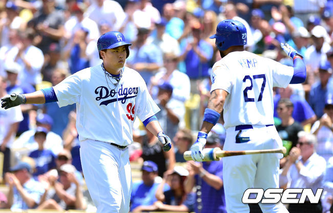 3일(한국시간) 미국 캘리포니아주 로스앤젤레스 다저스타디움에서 열린 '2014 메이저리그' LA 다저스와 클리블랜드 인디언스와의 경기, 5회말 2사 만루 이디어의 역전안타때 홈을 밟은 류현진이 맷 켐프와 하이파이브를 하고 있다.