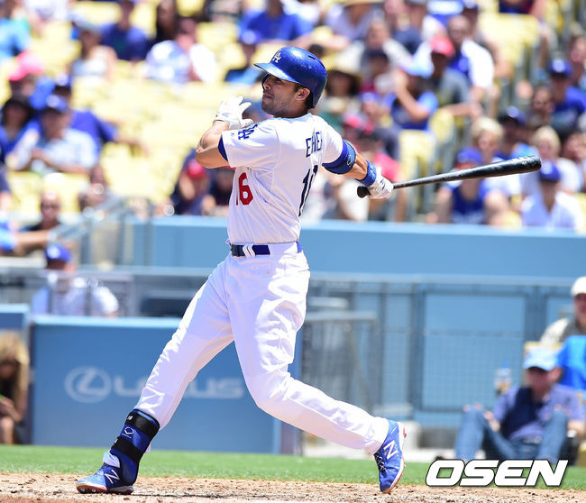 3일(한국시간) 미국 캘리포니아주 로스앤젤레스 다저스타디움에서 열린 '2014 메이저리그' LA 다저스와 클리블랜드 인디언스와의 경기, 5회말 2사 만루 이디어가 역전 2타점 적시타를 치고 있다.
