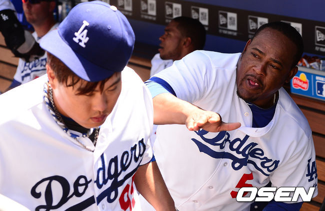 3일(한국시간) 미국 캘리포니아주 로스앤젤레스 다저스타디움에서 열린 '2014 메이저리그' LA 다저스와 클리블랜드 인디언스와의 경기, 다저스 유리베가 7회초 수비를 마치고 류현진이 클럽하우스로 들어가는 류현진에게 장난을 치고 있다.