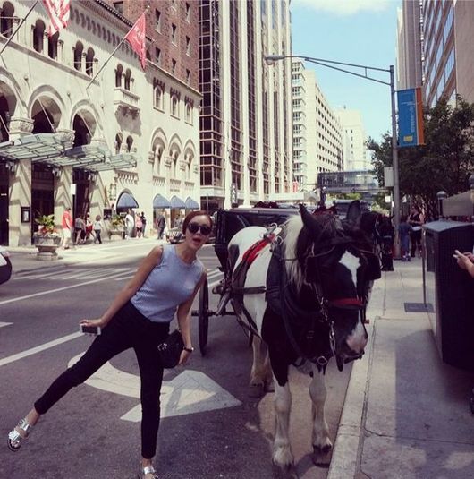 공개된 사진 속 백보람은 시카고의 다운타운에서 마차를 이끄는 말 옆에서 포즈를 취하고 있다. 그는 선글라스로 가려지는 작은 얼굴과 편안한 옷차림에도 돋보이는 몸매로 눈길을 끌고 있다.