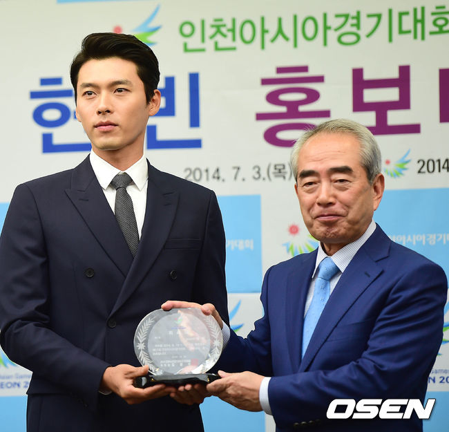 배우 현빈과 김영수 조직위원장이 3일 오전 서울 중구 프레스센터에서 열린 '2014인천아시아경기대회 홍보대사 위촉식'에 참석해 위촉패 전달식을 마친 뒤 기념촬영을 하고 있다.