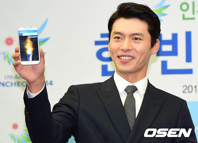 배우 현빈이 3일 오전 서울 중구 프레스센터에서 열린 '2014인천아시아경기대회 홍보대사 위촉식'에 참석해 온라인 성화봉송 '스마트 토치 릴레이'의 포즈를 취하고 있다.