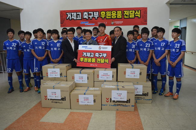 지난 2일 거제고등학교에서 대우조선해양 정성대 상무, 거제고등학교 윤정업 교장, 경남FC 박재영 단장이 참석한 가운데 유니품과 트레이닝복, 운동화 등 2000여 만 원 상당의 축구 용품 전달식을 가졌다.