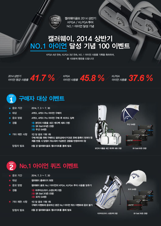 KPGA/KLPGA 투어 공식기록업체 씨엔피에스(C&PS)의 조사 결과에 따르면 올해 상반기 KPGA투어에서 45.8%, KLPGA투어에서는 37.6%를 기록한 캘러웨이골프의 아이언이 사용률 1위인 것으로 나타났다. KPGA투어에서는 사용률뿐 아니라 우승률에서도 1위를 달리고 있다. 한국캘러웨이골프는 이를 기념하기 위해 7월 3일부터 30일까지 No.1 아이언 달성 기념 100인의 행운 이벤트를 진행한다고 밝혔다.