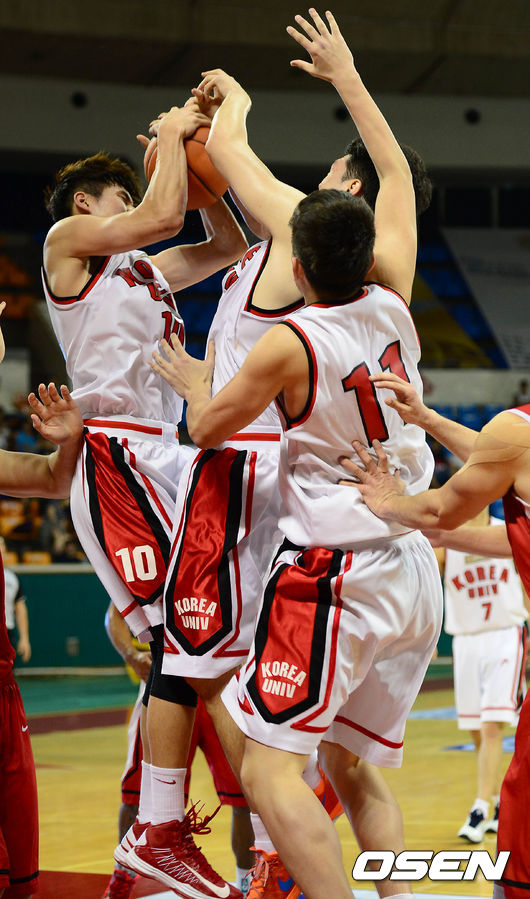고려대와 미국BYU와의 경기, 4쿼터 고려대 문성곤,강상재,이승현이 리바운드 하고 있다.