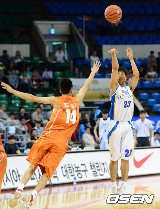연세대와 중국 NORTHEAST NORMAL University와의 경기, 2쿼터 연세대 허훈이 3점슛을 던지고 있다.
