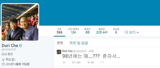 차두리는 3일 자신의 트위터에 "98년에는 왜....??? 혼자서..."라는 글을 남겼다. 이날 홍명보 축구대표팀 감독의 유임을 결정한 대한축구협회에 대한 뼈있는 돌직구다.