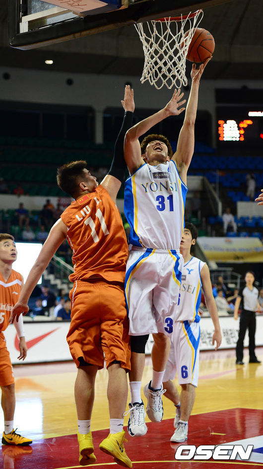연세대와 중국 NORTHEAST NORMAL University와의 경기, 2쿼터 연세대 주지훈이 골밑슛을 하고 있다.