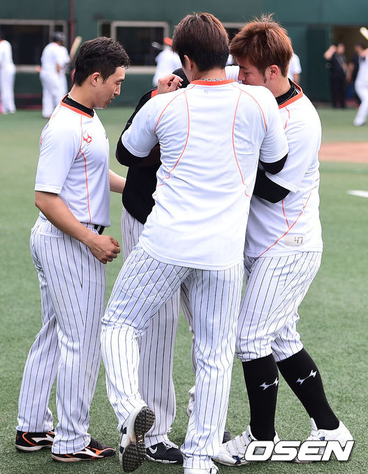 3일 오후 서울 목동구장에서 열린 2014 한국야쿠르트 세븐 프로야구 넥센 히어로즈와 롯데 자이언츠의 경기에 앞서 롯데 강민호와 손아섭, 전준우가 유먼에게 장난을 치고 있다.