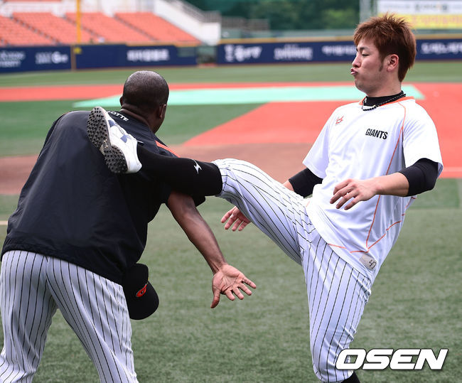 3일 오후 서울 목동구장에서 열린 2014 한국야쿠르트 세븐 프로야구 넥센 히어로즈와 롯데 자이언츠의 경기에 앞서 롯데 강민호가 유먼과 장난을 치고 있다.